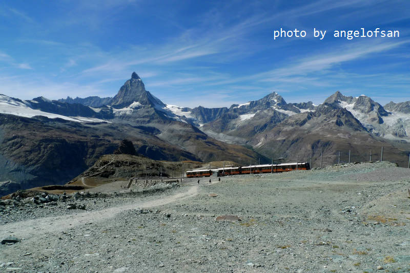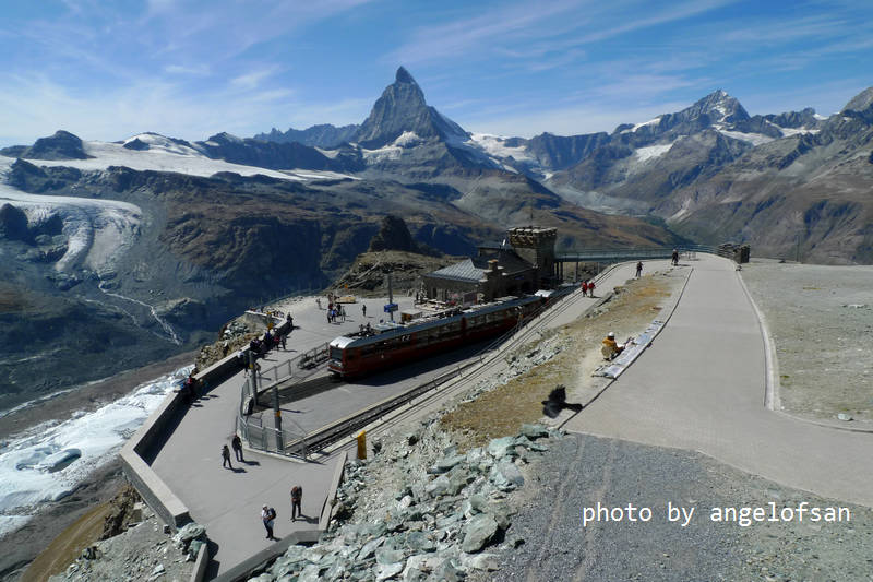 車站、列車與馬特洪峰,可以看見鐵路是齒軌式鐵道,能帶動火車通過陡峭山坡,這段路線也是瑞士第一條電動齒軌鐵道。